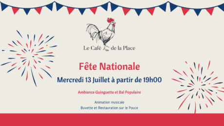 Le Café de la Place sera exceptionnellement fermé le Jeudi 14 Juillet … pour mieux vous retrouver Vendredi 15 Juillet dès 9h00 🙂 !